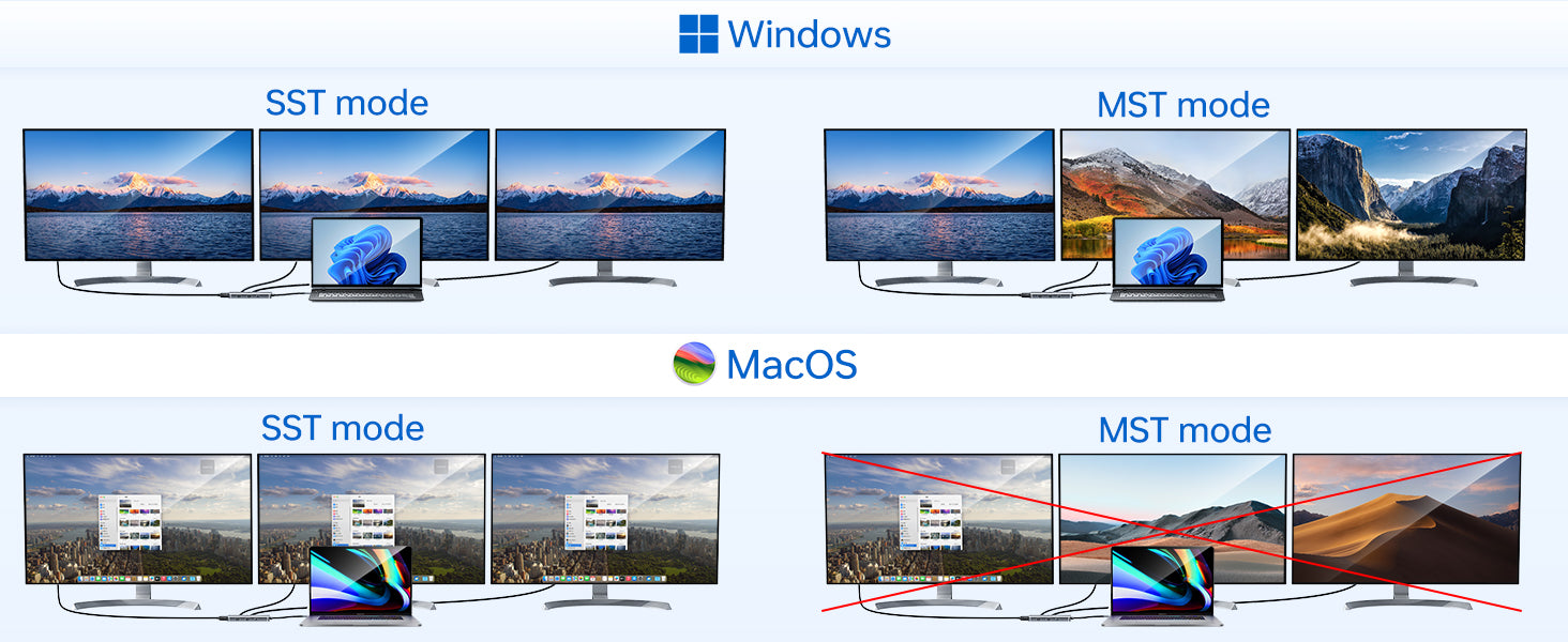 MacOS dual display:HDMI1 + HDMI2 (All 4K@30Hz), HDMI1/2 + VGA (All 1920*1080@60Hz)