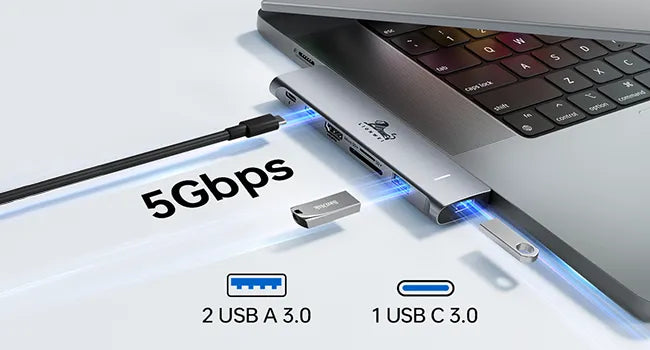 2 X USB A 3.0 and 1 USB C 3.0 Ports (At Full-Speed,up to 5 Gbp/s): Allow you to connect keyboard, mouse, hard drive,etc to MacBook Pro,Up to 5Gbps data transmission speed, down compatible with USB A 2.0 and below.