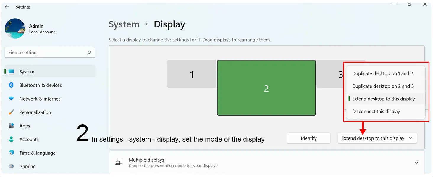 When you connect HDMI1 alone, it can output 4K@30Hz high resolution; when you connect 2 HDMIs, it can output up to 4K+1080P (extend mode), which depends on your monitor and laptop.